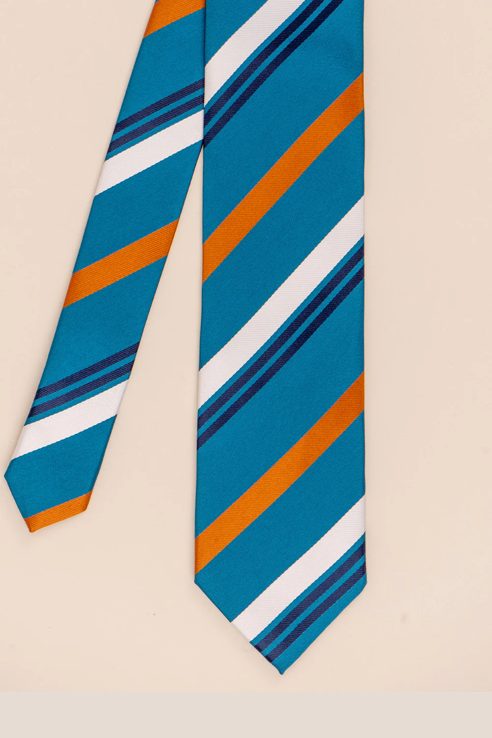Elevate any special occasion with Evan Teal - a timeless vintage-style tie with airforce blue, gold, and white stripes. Perfect for a wedding or a sophisticated party, this 7.5cm width tie brings a touch of luxury to any look. Make a statement with Evan Teal.